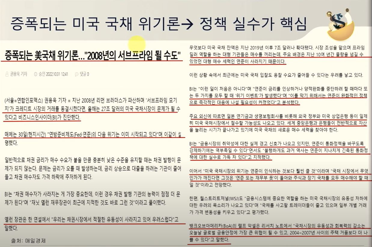 연준 금융안정보고서에서 금융안정 측면에서의 불안감이 언급되었다. 5월에는 없었던, 채권시장 유동성 감소와 불안정성에 대한 언급이 추가된 것. 물가 고착보다 더 무서운 게 금융불안. 금융불안이 터지게 되면 10년짜리 퇴행도 각오해야 한다. 금리 인상이 국채 위기론으로 번지고 있는 상황. FED에서는 다음 위기가 이미 시작되고 있다고 언급한 바 있으며 옐런 재무장관도 채권시장에서의 적절한 유동성이 사라지고 있다고 언급한 바 있음.