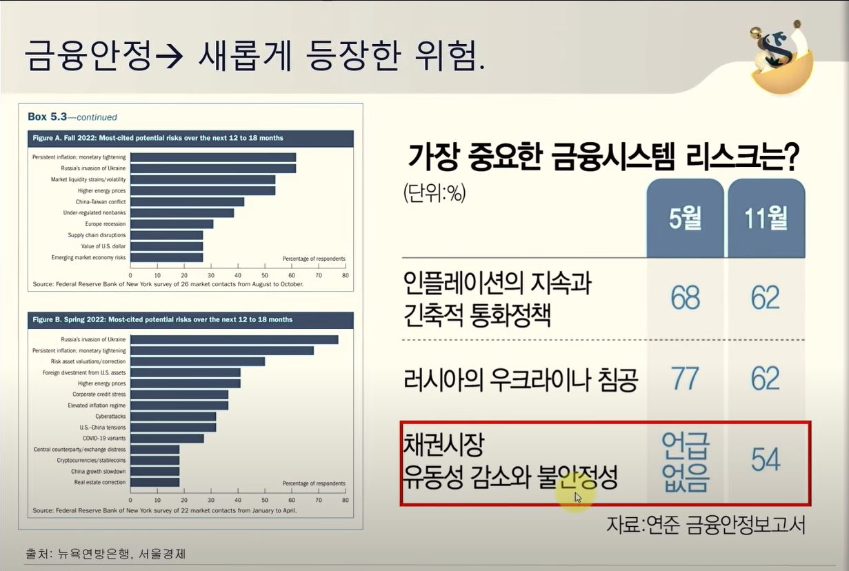 현재의 금리상승으로 인한 유동성문제는 은행보다는 보험사에 치중. 은행이야 그동안 여러 규제를 통해 준비가 되어 왔지만 보험사는 그렇지 않았기 때문. 보험사들의 가장 큰 포지션 중 하나가 국채였을 거고, 금리 인상으로 인해 국채의 가격이 급락하자 보험사들의 재정건전성에 문제가 생기고 있다. 개인적으로는 4.5% 이상으로 금리를 올리기는 힘들거라고 본다.
